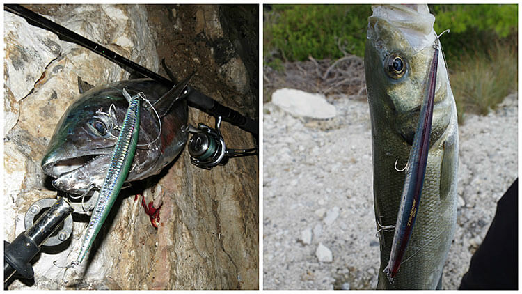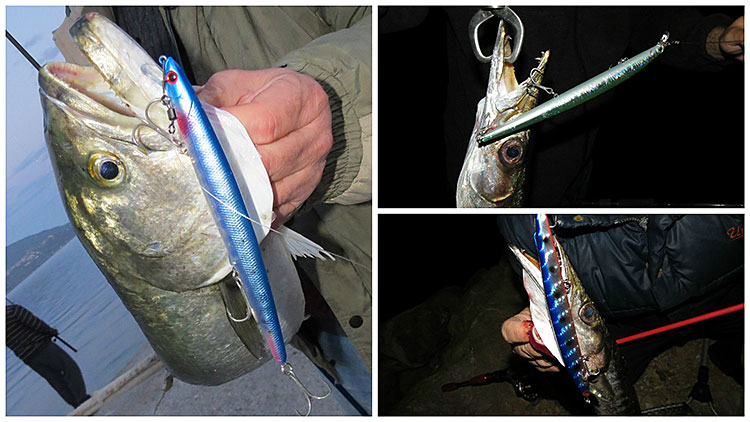 [caption id="attachment_1035" align="aligncenter" width="750"]Ляво: Лаврак атакувал Tide Minnow Slim 200 Flyer! Размерът на рибата спрямо воблера нямат сравнение. Дясно горе: Tide Minnow Slim 200 в цвят Barracuda HD е добре познат с успеха си сред баракудите. Дясно долу: Tide Minnow Slim 200 в оцветяване Chartreuse е смъртоносен през размножителния сезон.[/caption]